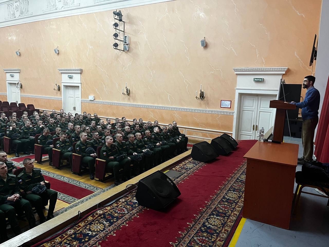 С молодым пополнением Преображенского полка состоялась вводная беседа о том, что такое Преображенский полк, чем он знаменит, какие замечательные люди в нём служили. Также обсудили вопрос о том, какие цели преследовало наше государство, возрождая полк, возможно ли это, и как добиться поставленной цели. Беседу провёл О. Н. Хлестов, правнук полковника лейб-гвардии Преображенского полка Д. Д. Зуева и директор Международного фонда потомков офицеров лейб-гвардии Преображенского полка.