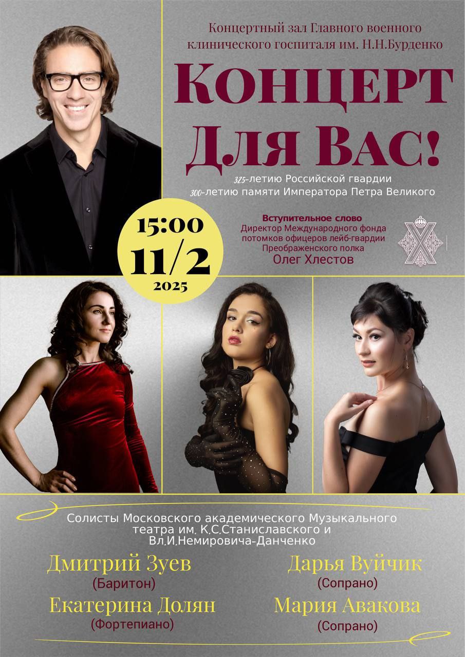 Совместными усилиями Международного фонда потомков офицеров лейб-гвардии Преображенского полка и ветеранской организации Преображенского полка МРОО "Преображенцы" 11 февраля 2025 г. в Главном военном госпитале им. Н. Н. Бурденко состоялся благотворительный концерт, посвящённый 325-летию Гвардии и 300-летию памяти Петра Великого.
